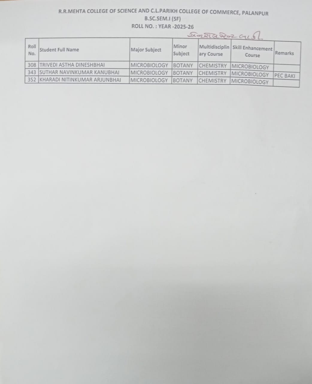 List of Enrollment Pending Students of B.Sc. Sem 1 SF 2025 26