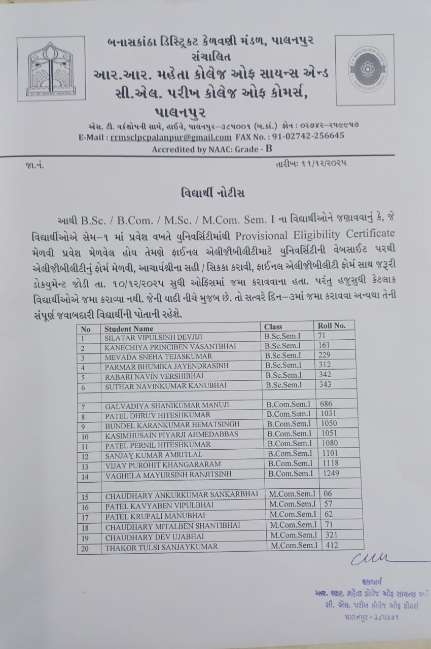 ઉપરોક્ત વિદ્યાર્થીઓએ તાત્કાલિક આધારકાર્ડમાં નામ સુધારી દિન-૨ માં સુધારેલા આધારકાર્ડની કોપી કાર્યાલયમાં જમા કરાવવી અન્યથા પ્રવેશ સબંધિત જવાબદારી જે તે વિદ્યાર્થીની રહેશે.